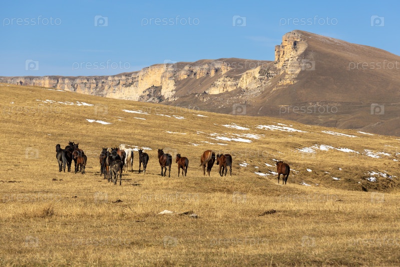Стадо лошадей пасется на склоне перевала Гумбаши на фоне горного хребта. Республика Карачаево-Черкесия в Северном Кавказе. живописный природный пейзаж с дикими конями
