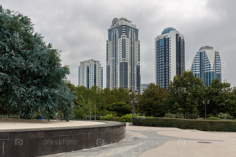 Вид на городской парк и здания новых современных небоскребов Грозного в пасмурный день, Чеченская Республика, Россия