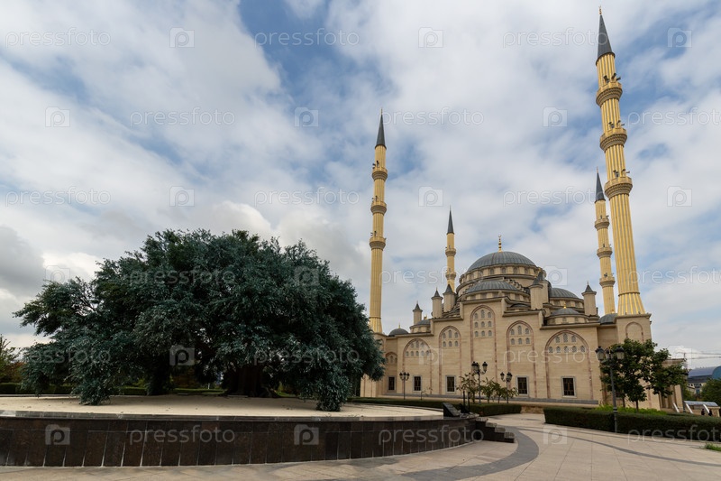 Вид на строительство мечети Ахмада Кадырова (известной как Сердце Чечни) в Грозном в пасмурный день, Чеченская Республика, Россия, Северный Кавказ.Путешествия и религиозная архитектура
