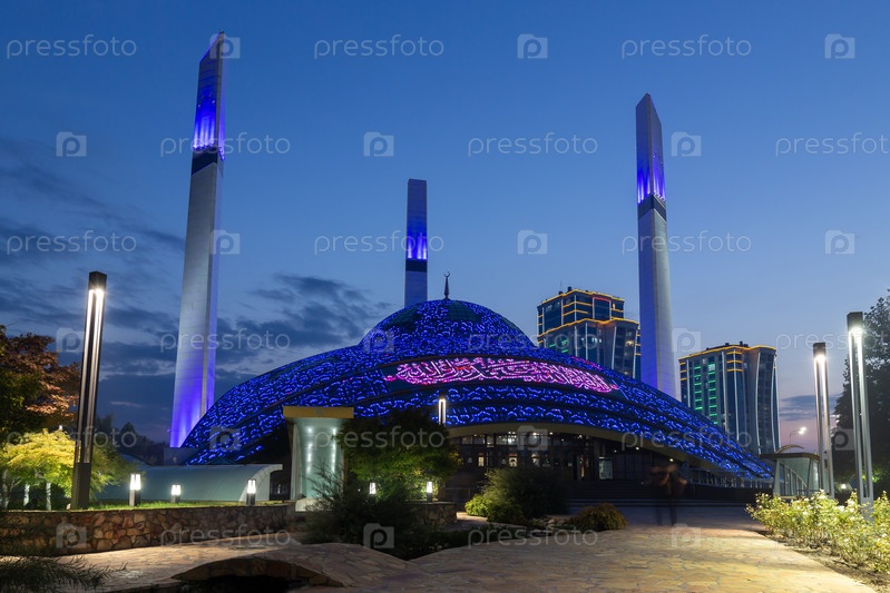 Вид на освещенную высокотехнологичную мечеть 'Сердце матери' в Аргуне