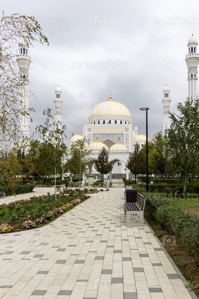 Шали, Чеченская Республика, Россия - 23 сентября 2023 года: хорошо ухоженный парк вокруг современной мечети из белого мрамора Гордость мусульман, названная в честь пророка Мухаммеда в пасмурный день