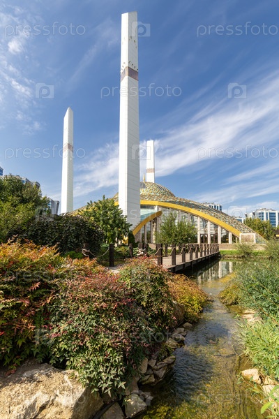 Красивая благоустроенная территория перед мечетью Аймани Кадыровой 'Сердце матери' в высокотехнологичном стиле в солнечный день, город Аргун, Чеченская Республика, первая мечеть в России в ультрасовременном стиле