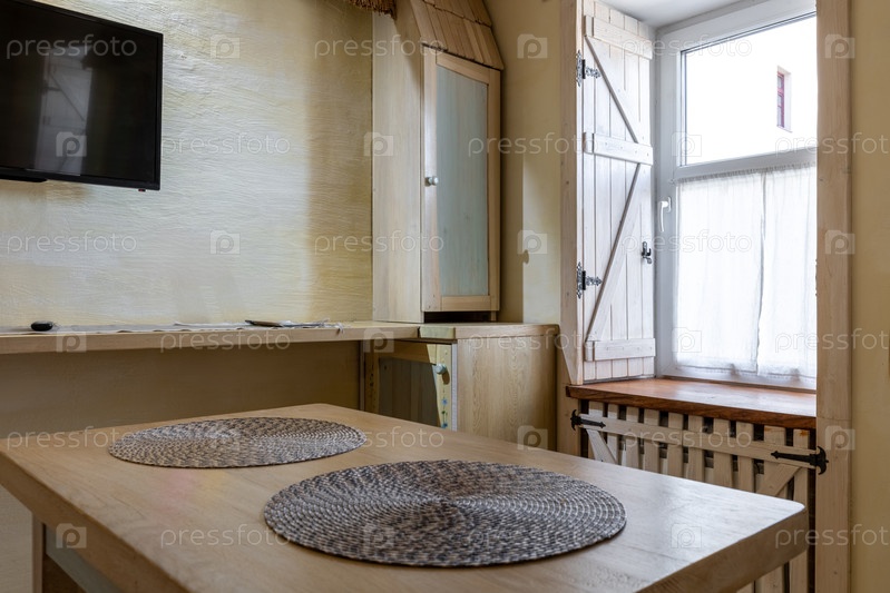 Внутренняя деталь обеденной зоны фермерского дома с массивным деревянным столом с плетеными плацентами, естественным светом из окна с деревянными жалюзи и уютной атмосферой