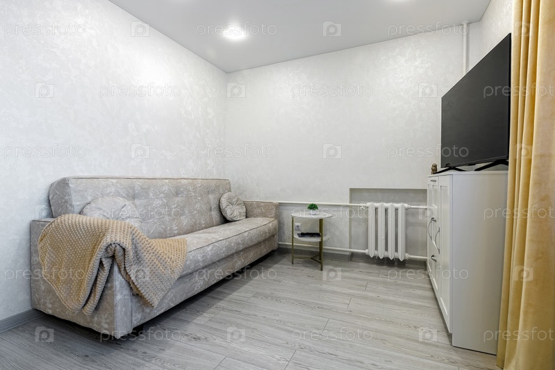 Яркий интерьер гостиной с бежевым диваном и телевизором на белом шкафу