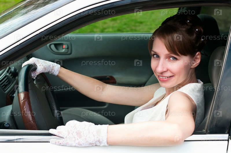 Женщина в белом платье и белых перчатках сидит в машине в качестве водителя