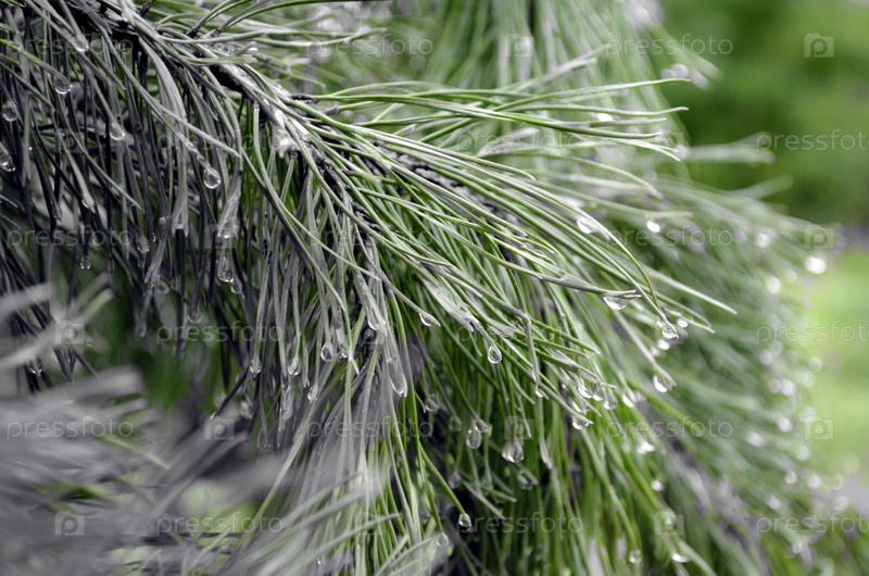 Капли дождя на сосновой ветви