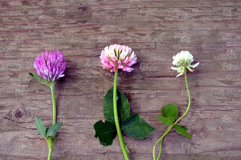 Различные виды клевера на деревянном фоне