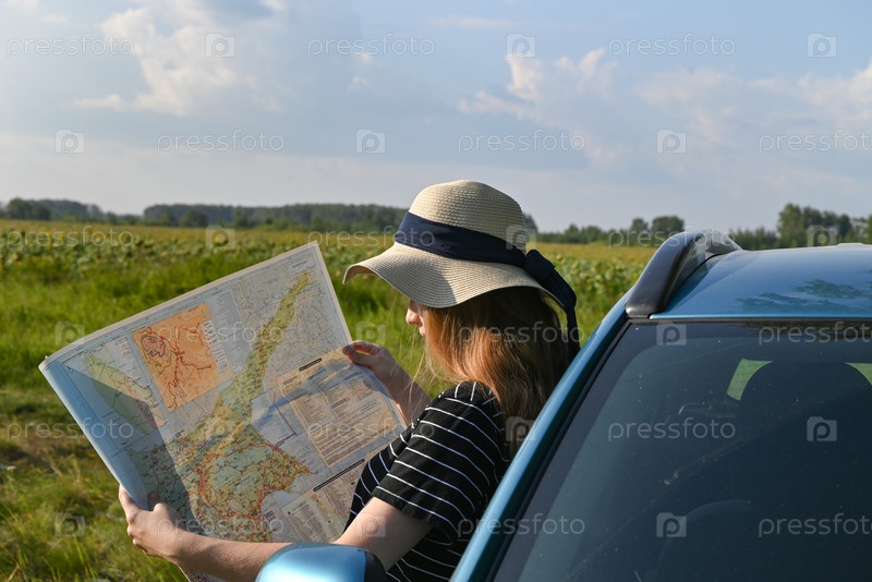 Задние кадры пары, едущей по сельской дороге.Женщина держит карту и показывает маршрутный план своему парню за рулем машины.Пара на дороге