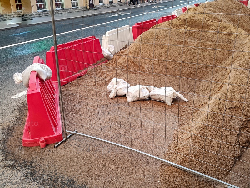 Строительные барьеры и песчаные свалки создают временную блокировку на городской улице