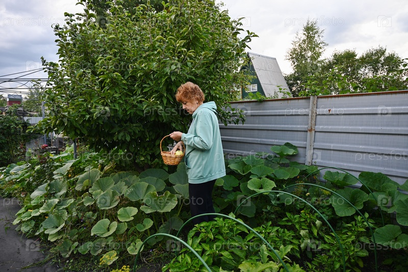 Пожилая женщина, собирающая яблоки с дерева в домашнем саду в конце летнего дня