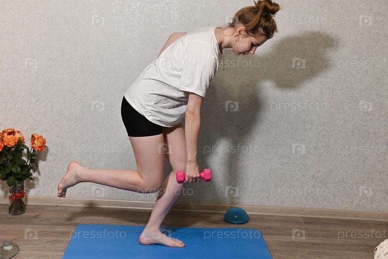 Женские упражнения на гантели в домашнем тренажерном зале во время тренировки в помещении