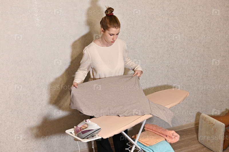Женщина гладит нижнее белье и одежду дома, стирает домашнюю работу с текстильным уходом