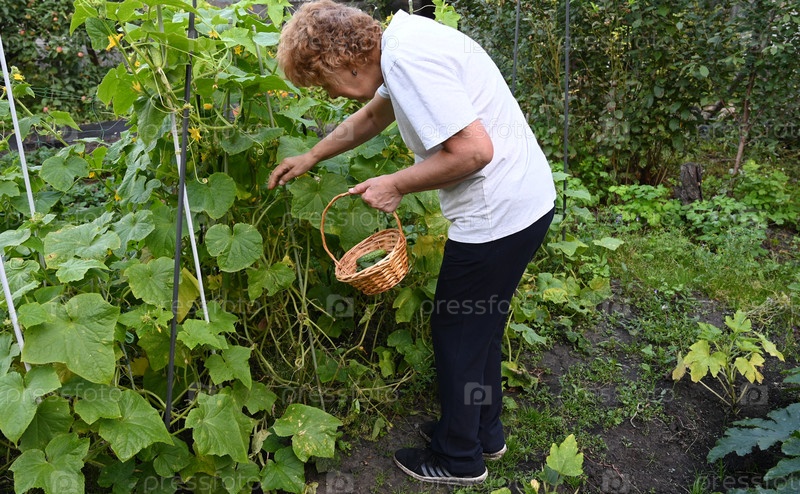 Пожилая женщина собирает огурцы в саду в солнечный день