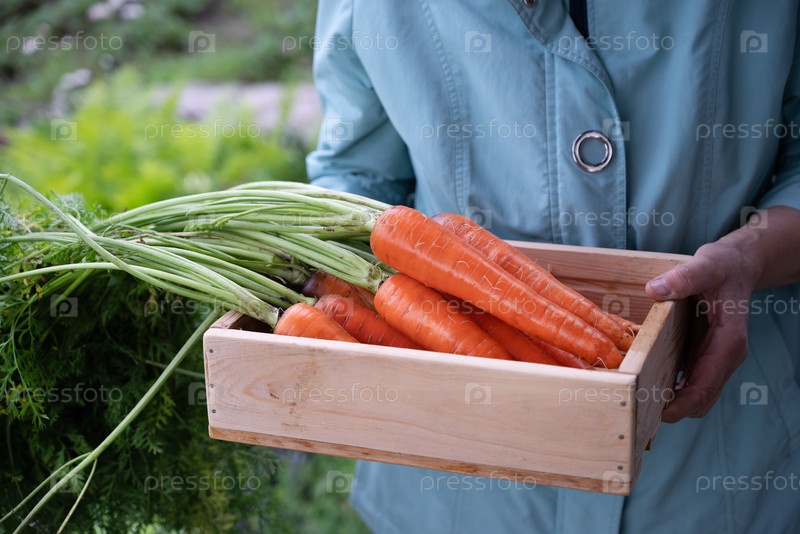 Сбор свежих морков в домашнем саду, окруженный пышными зелеными растениями в солнечный день