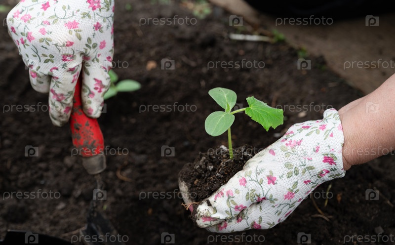 Руки сажают молодые саженцы в сад весной, окруженные богатой почвой и садовыми инструментами