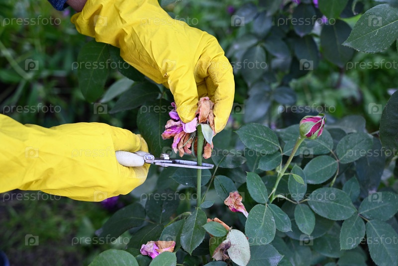 Садовник обрезает мертвые листья и цветы розового куста в ярком саду весной