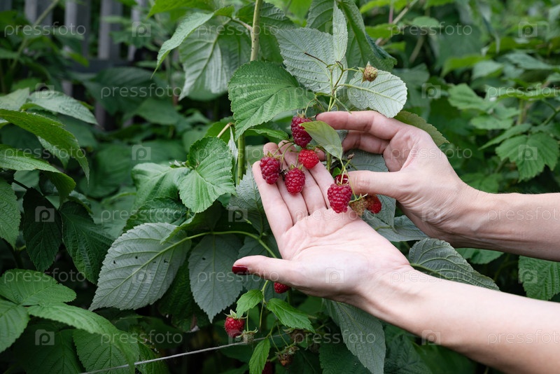 Садоводство, сбор урожая, концепция сельского хозяйства. Покрытие руки пожилой женщины, собирающей малину в открытом саду. Выборочное внимание к красной ягоде в руке