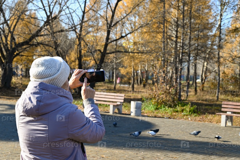 Пожилая женщина смотрит на голубей в парке в солнечный осенний день