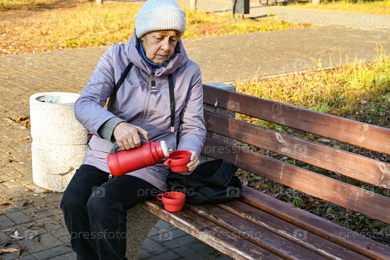 Пожилая женщина наслаждается горячим напитком в парке сегодня днем