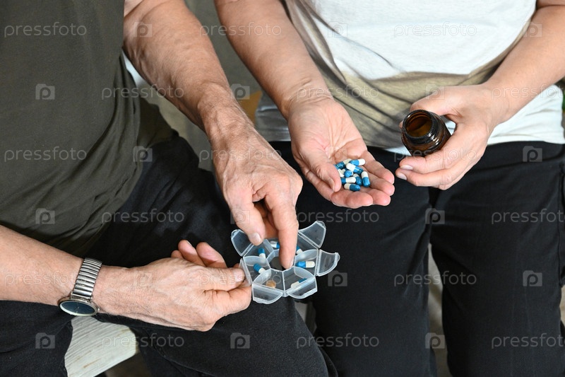 Люди сортируют таблетки из контейнера в общей жилой комнате в дневное время