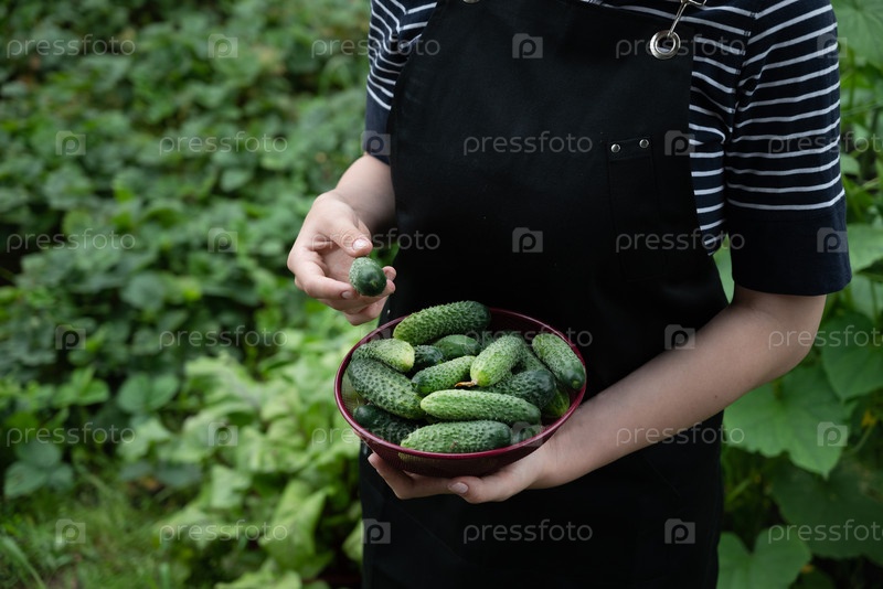 Сбор свежих огурцов в оживленном саду в летние месяцы