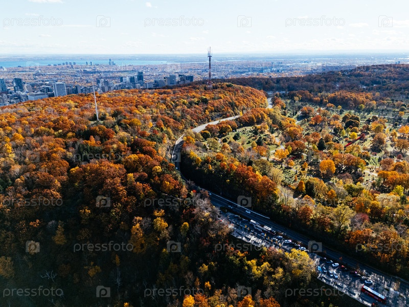 Вид из воздуха на Монреаль и Маунт-Рояль осенью, напоминающий о природе и химии окружающей среды