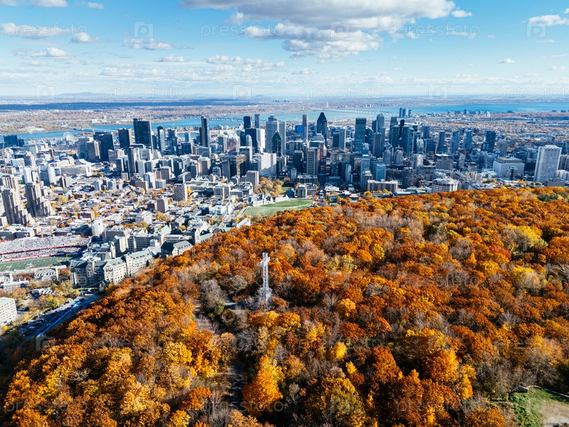 Осенний воздушный вид горизонта Монреаля и Парка Маунт-Роял с яркими осенними листьями. g