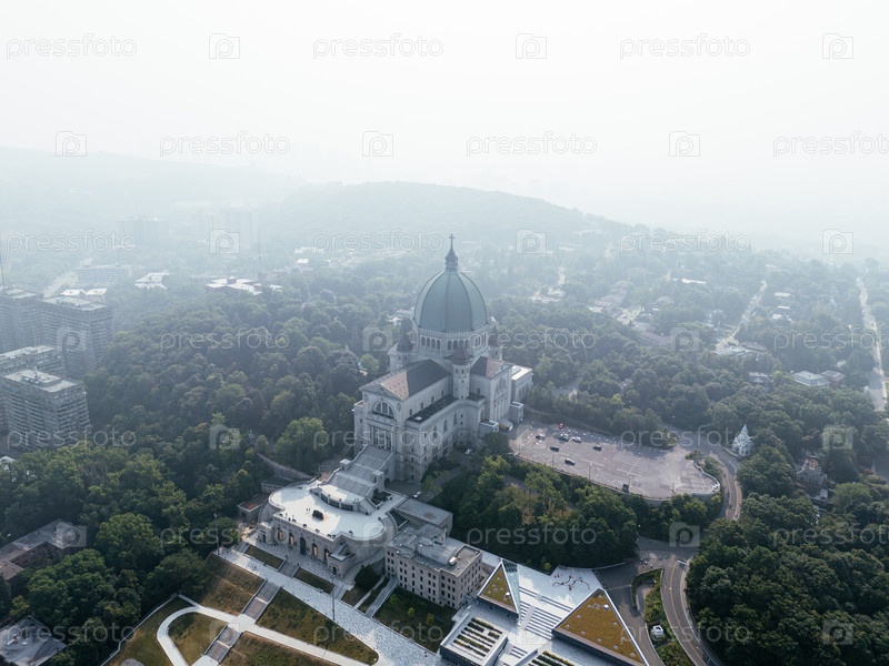Вид с воздуха Оратория Святого Иосифа среди смога, тумана и тумана над горизонтом Монреаля и зелеными холмами