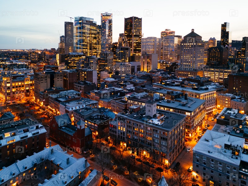 Вечерний горизонт Монреаля с освещенными улицами в районе Старого порта. g