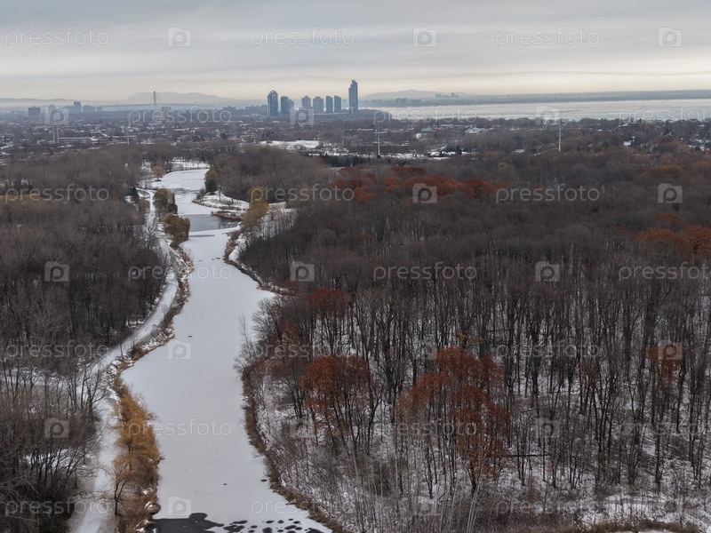 Зимний вид из воздуха на пригороды Монреаля, снежный парк Ангриньон и реку возле Лачина и Вердена под облачным небом