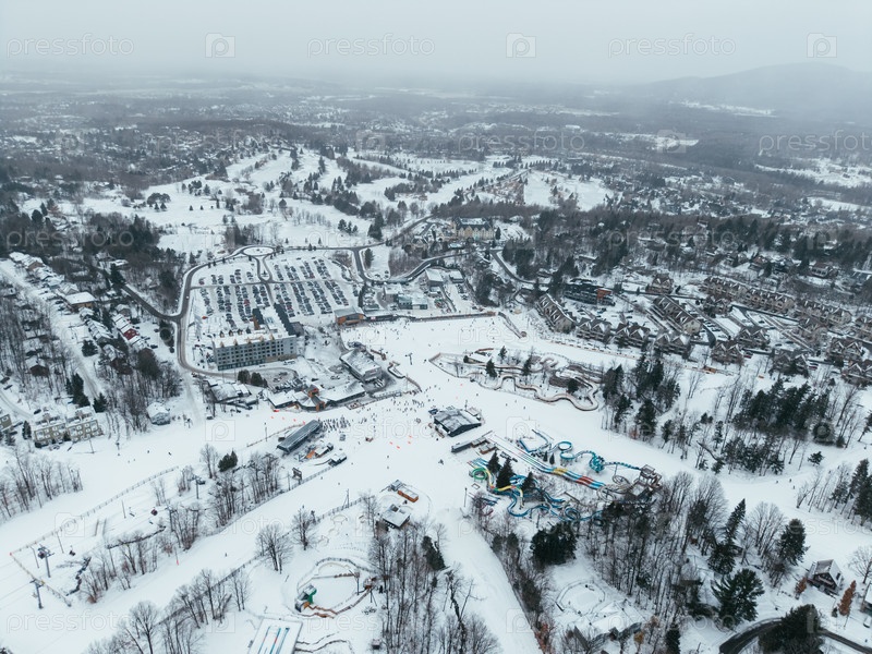 Зимний вид с воздуха на горнолыжный курорт Bromont со снежными склонами, деревней и парковкой в Квебеке, Канада