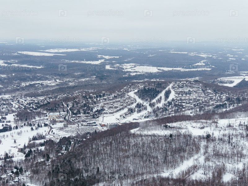 Зимний вид с воздуха на горнолыжный курорт Bromont со снежными склонами, деревней и парковкой в Квебеке, Канада