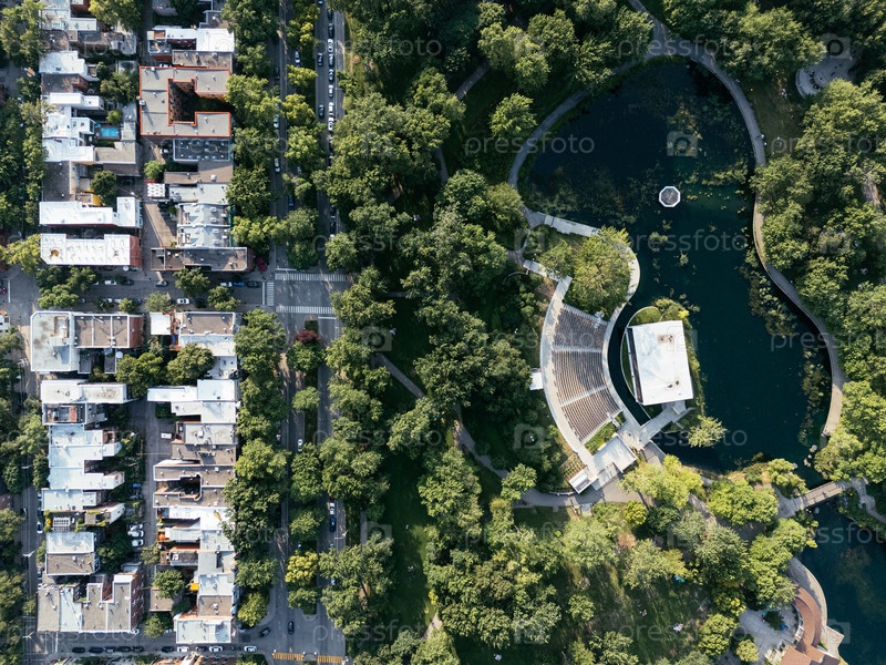 Летом беспилотный летающий аппарат над парком Ла-Фонтен, в центре города на заднем плане.Монреаль, Квебек, Канада