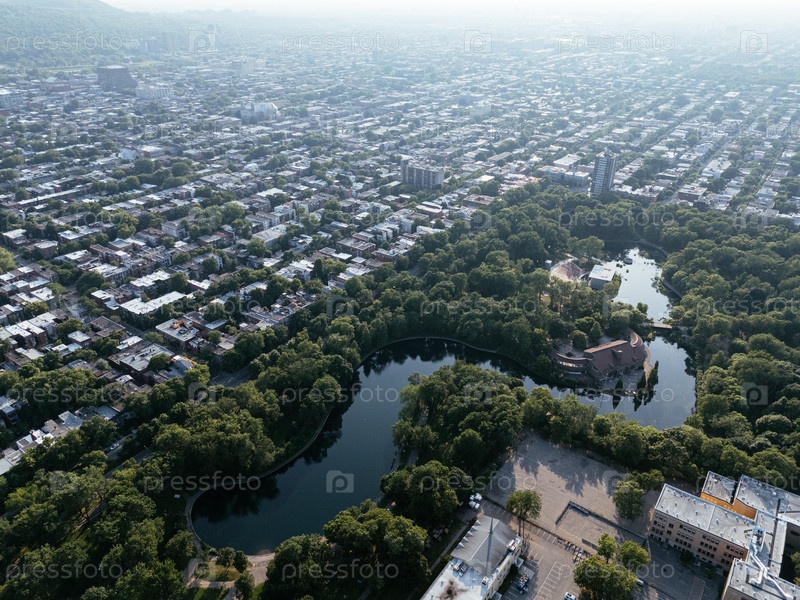 Летом беспилотный летающий аппарат над парком Ла-Фонтен, в центре города на заднем плане.Монреаль, Квебек, Канада