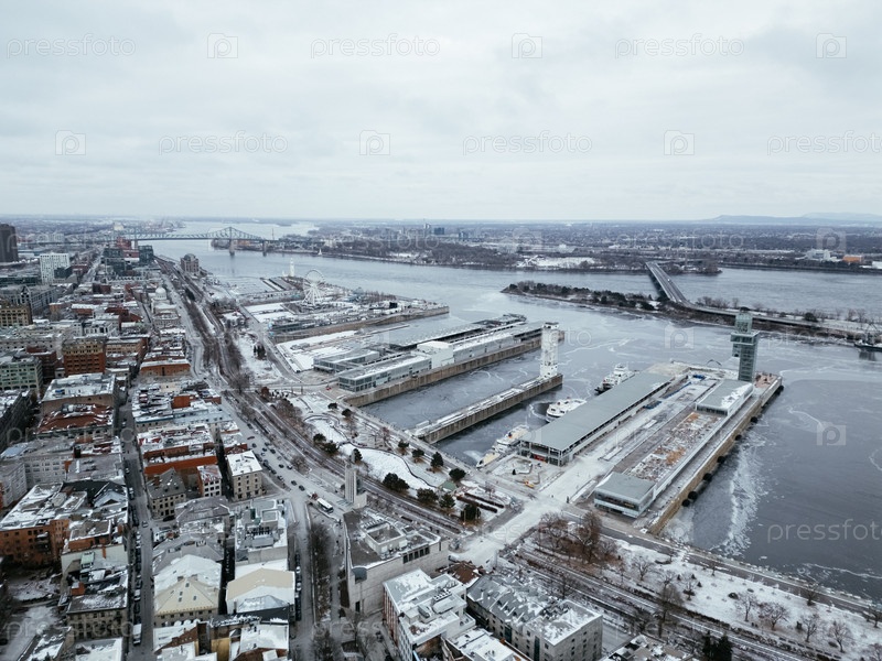Зимний вид на прибрежный берег Старого Порт-Сити с развлекательной зоной.Монреаль, Канада