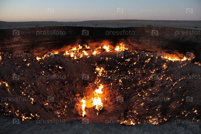 Горящий газовый кратер Дарваза в пустыне Каракум на закате, естественная яма огня в Туркменистане