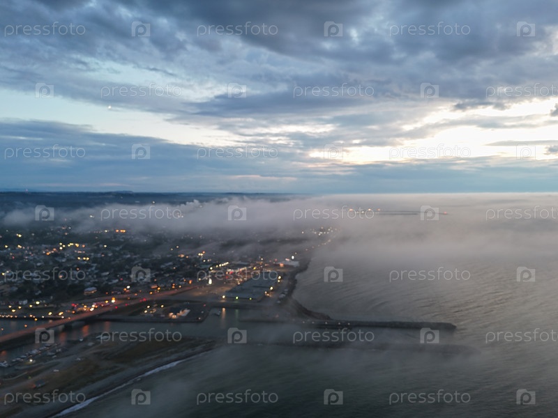 Вид из воздуха города Матане на закате с рекой, туманом, низкими облаками и городскими огнями вдоль реки Святого Лоуренса, Квебек, Канада