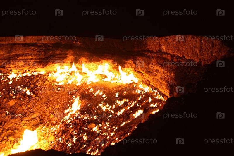 Горящий газовый кратер Дарваза в пустыне Каракум на закате, естественная яма огня в Туркменистане