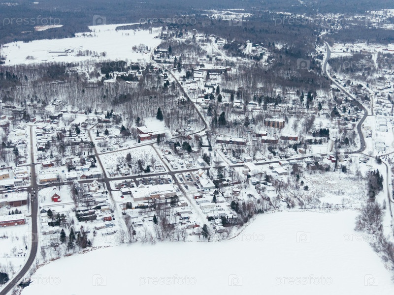 Вид на Ватерлоо с замерзшим озером, снежными домиками и дорогами, Квебек, Канада
