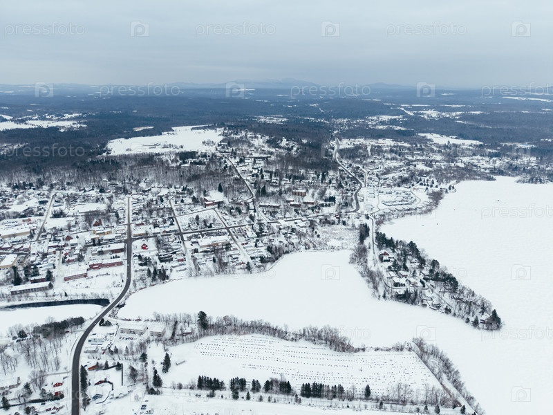 Зимний вид из воздуха города Ватерлоо с замерзшим озером, кладбищем, снежными домиками и дорогами, Квебек, Канада