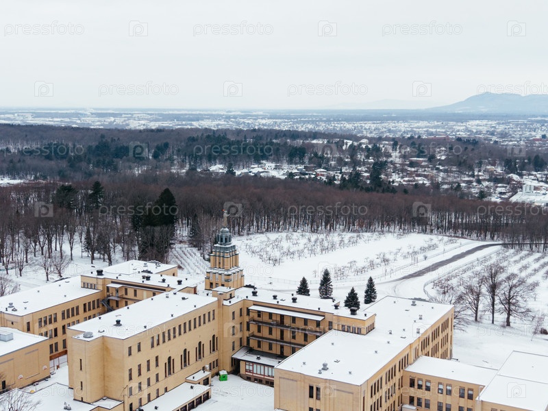 Зимний взгляд с воздуха на кампус средней школы Мон-Сакре-Кьор со снежными зданиями и лесом, Гранби, Квебек, Канада
