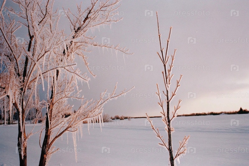 Ледники на замерзших ветвях сияют при закате солнца вдоль снежной канадской улицы зимой