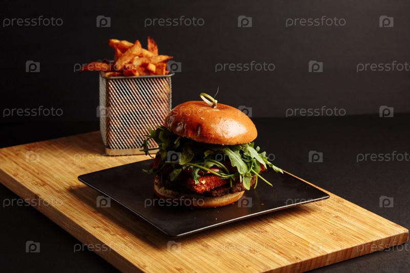 Сочный бургер с салатами и хрустящими картофелями на деревянной доске под теплым освещением
