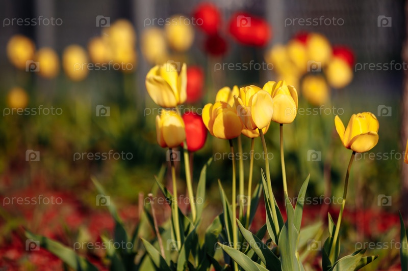 Желтые и красные тюльпаны цветут под теплым светом в весеннем саду