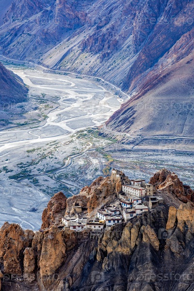 Знаменитая индийская туристическая достопримечательность монастырь Данкар расположен на скале в Гималаях.Данкар, долина Спити, Химачал-Прадеш, Индия