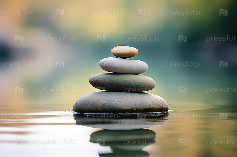 Куча дзен-камней на воде с естественным фоном. изображение передает ощущение равновесия, гармонии и мира. подходит для использования в концепциях исцеления, терапии и релаксации