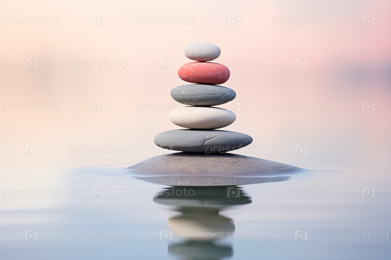 Куча дзен-камней на воде с естественным фоном. изображение передает ощущение равновесия, гармонии и мира. подходит для использования в концепциях исцеления, терапии и релаксации