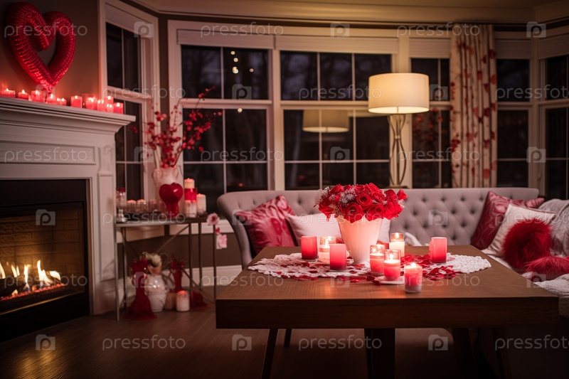 Уютная гостиная, украшенная декорациями на День святого Валентина, с розовыми воздушными шарами, букетом роз и свечами создает романтическую атмосферу