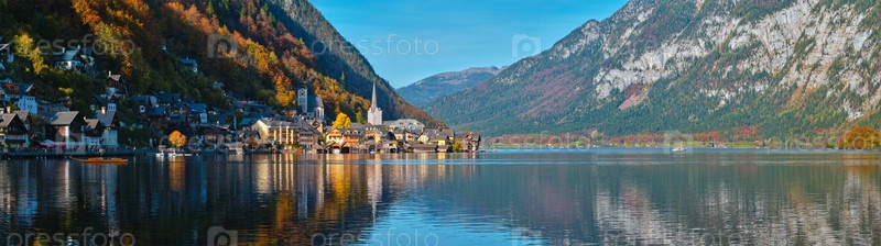 Панорама австрийского туристического направления деревня Холлштатт на холлестаттере Смотрите в австрийских Альпах осенью с традиционной австрийской лодкой. регион Сальцкаммергут, Австрия