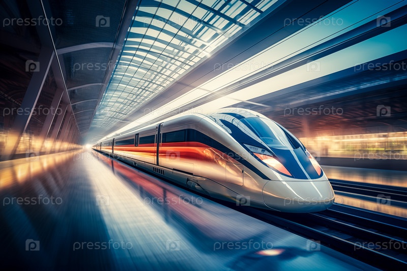 Современный высокоскоростной поезд на футуристической станции.Современные транспортные технологии, скорость, концепции путешествий.Железная дорога с эффектом размытия движения